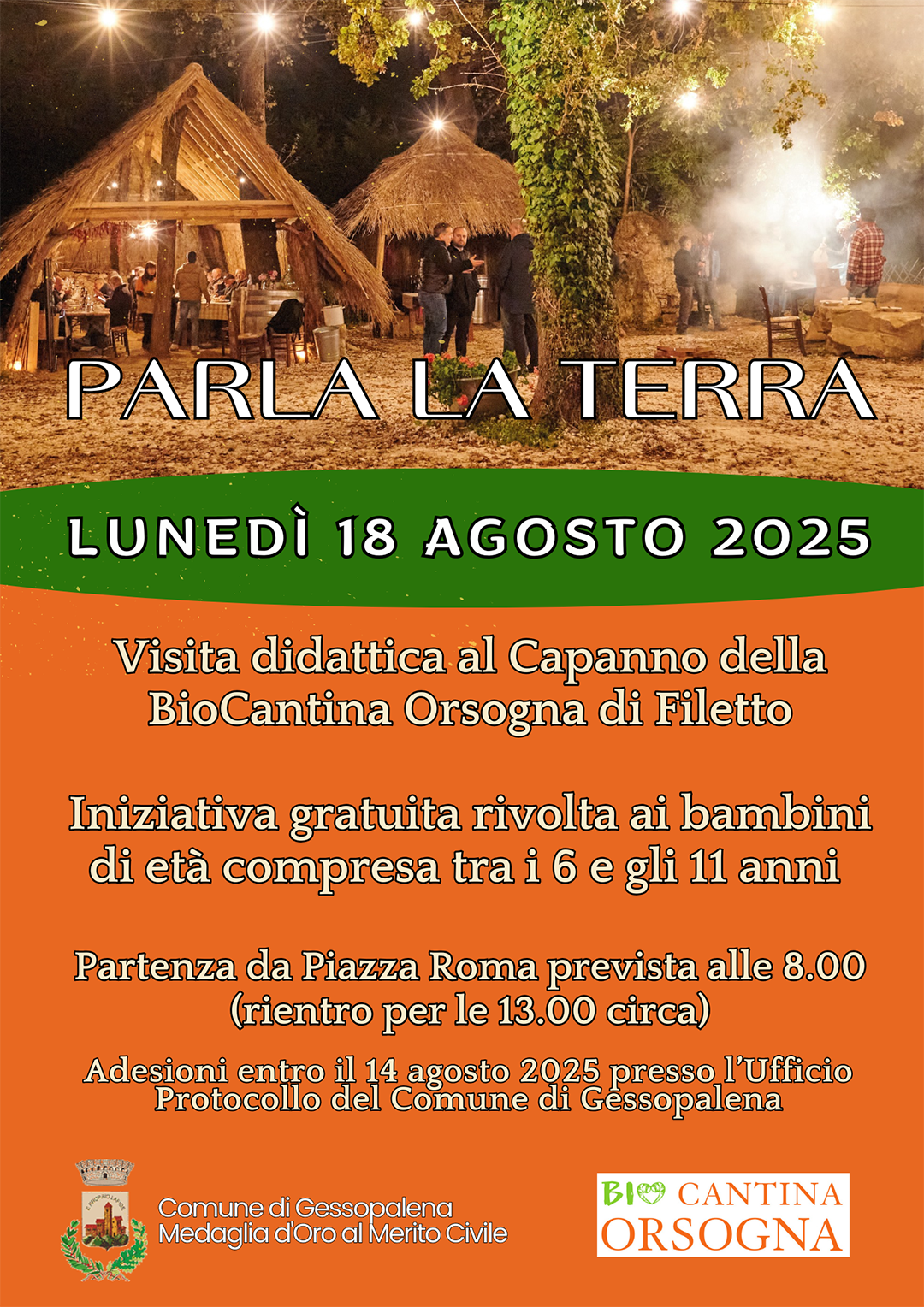 Si rende noto che l’Amministrazione comunale, in collaborazione con la BioCantina Sociale Orsogna, organizza l’iniziativa per bambini denominata “PARLA LA TERRA” - Visita didattica al Capanno della BioCantina Orsogna di Filetto rivolta ai minori di età compresa tra i 6 e gli 11 anni (e comunque iscritti per l’A.S. 2025/2026 alla classe I della Scuola Primaria) che si terrà presso Filetto, lunedì 18 agosto prossimo.